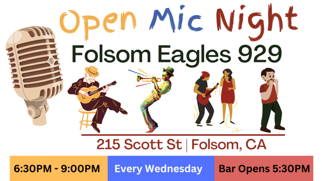 Sign-in begins at 6:00PM and sounds begin at 6:30PM – 9:00PM. All musicans have 15 minutes or 3 songs to show off your talents. PA system, amps and microphones are provided and ready for you to plug in.